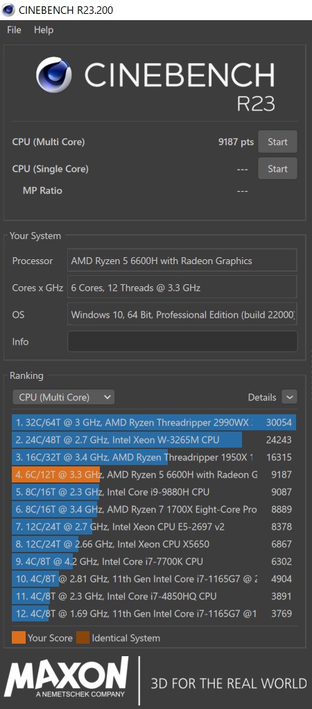 | CPU | AMD Ryzen 5 6600H(6コア12スレッド、3.30 GHz / 4.50 GHz) |